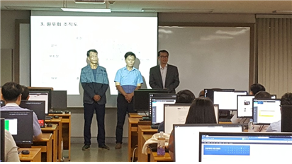 △ 원우회 임원진 소개 모습(왼쪽부터 감사 황 진, 부회장 박형철, 회장 양재용)