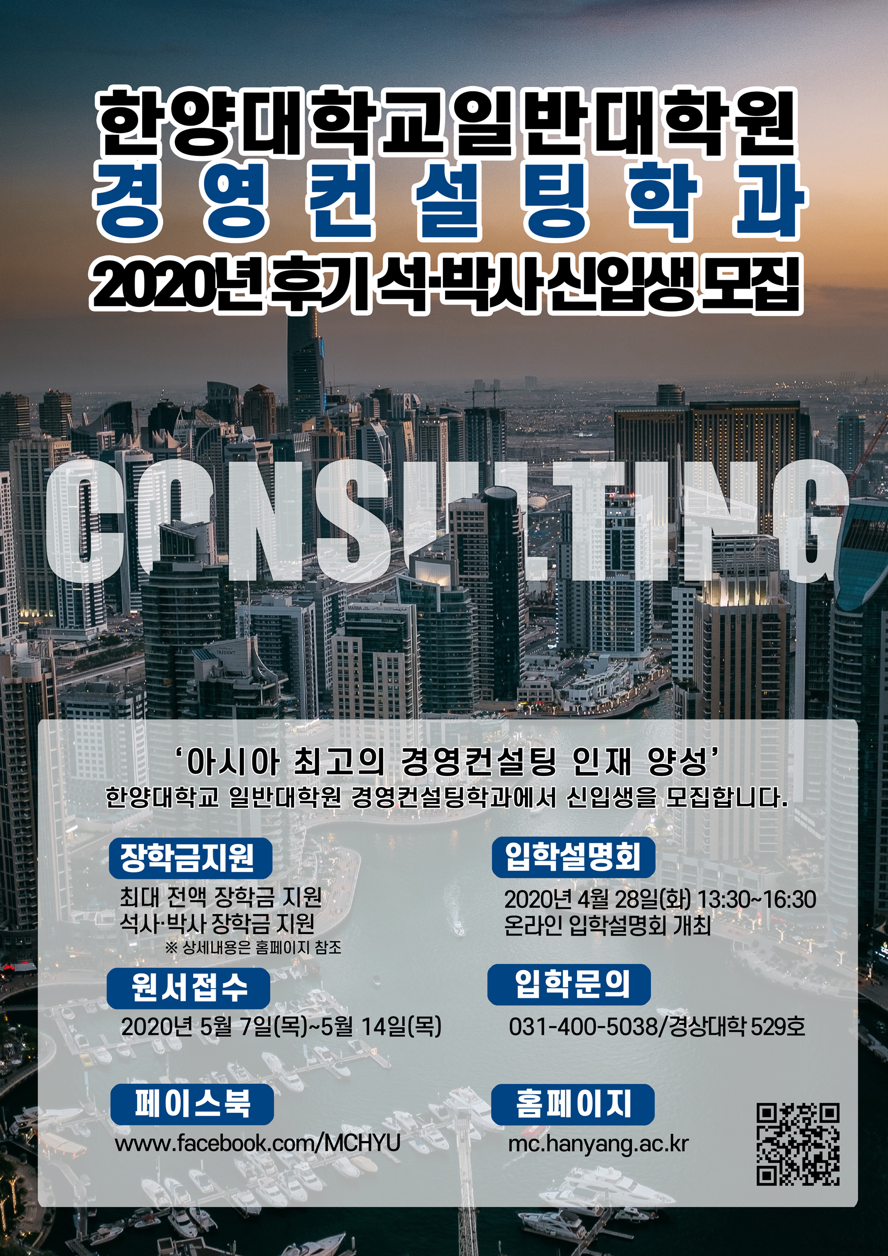 한양대학교 일반대학원 경영컨설팅학과는 2020년 후기 신입생을 모집합니다.